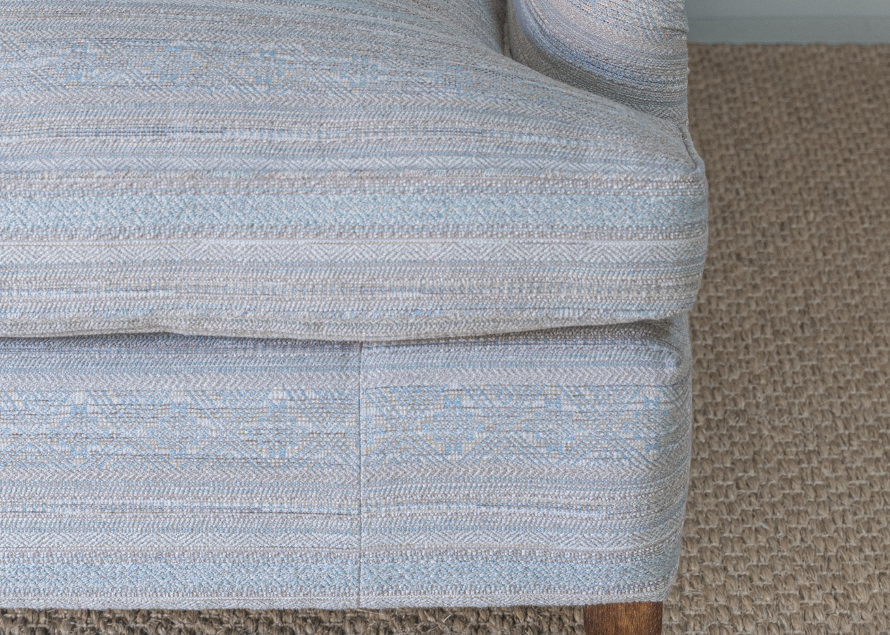 An elegant down feather filled fixed back upholstered settee with down filled seat interior.