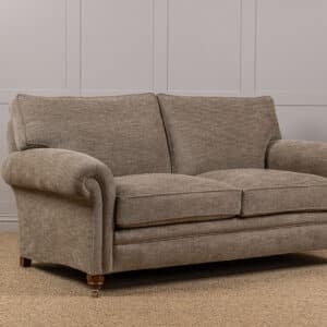 An elegant feather and down filled fixed back upholstered settee with feather and down filled seat interiors.
