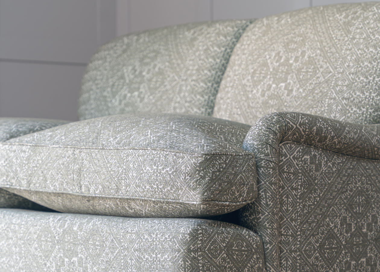 An elegant down feather filled fixed back upholstered armchair with down filled seat interior