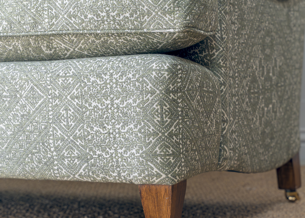 An elegant down feather filled fixed back upholstered armchair with down filled seat interior