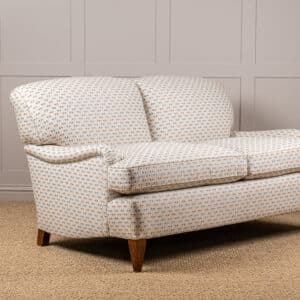 Fixed upholstered back two seater Settee with down and feather seat cushion interiors, leg and castor colour to your choice.