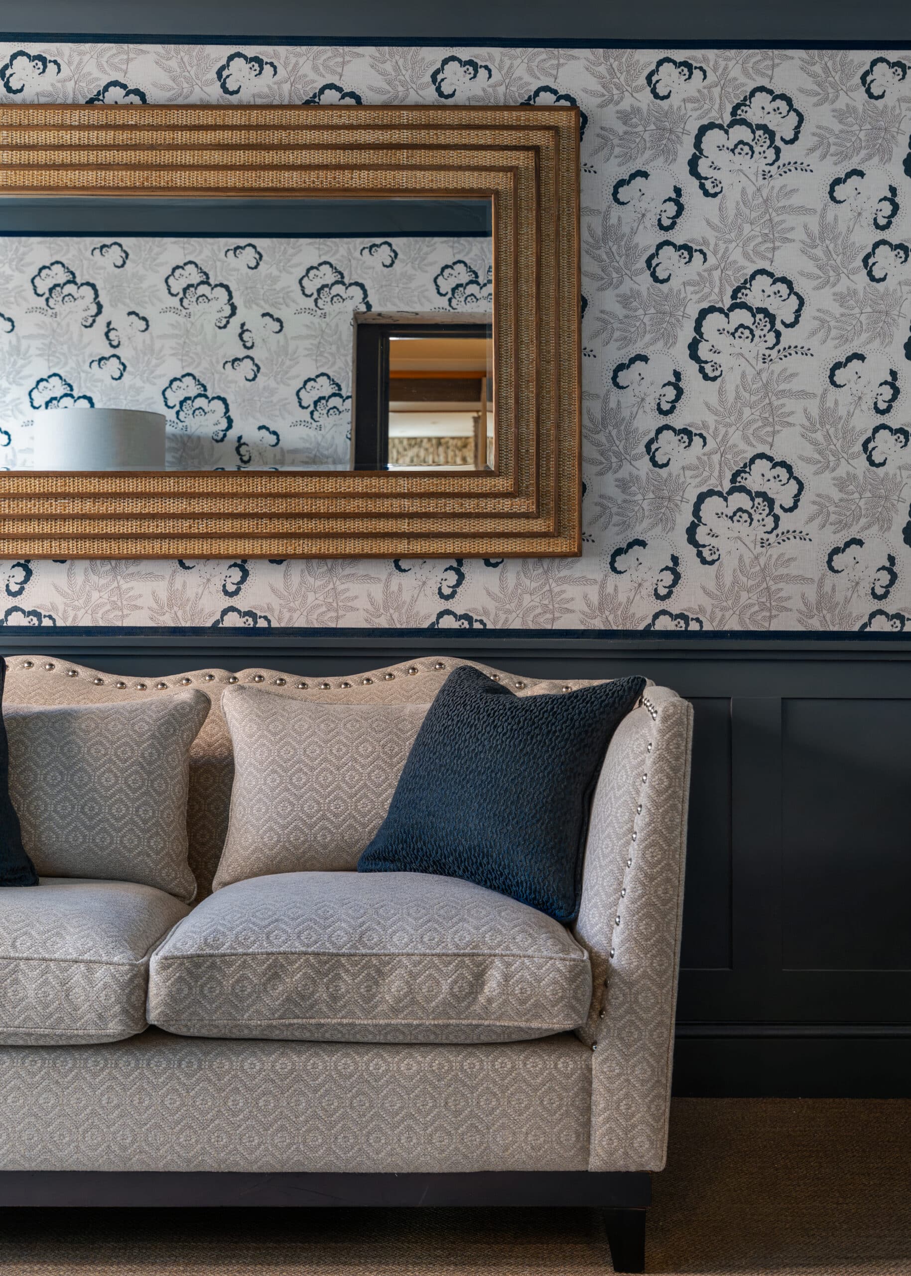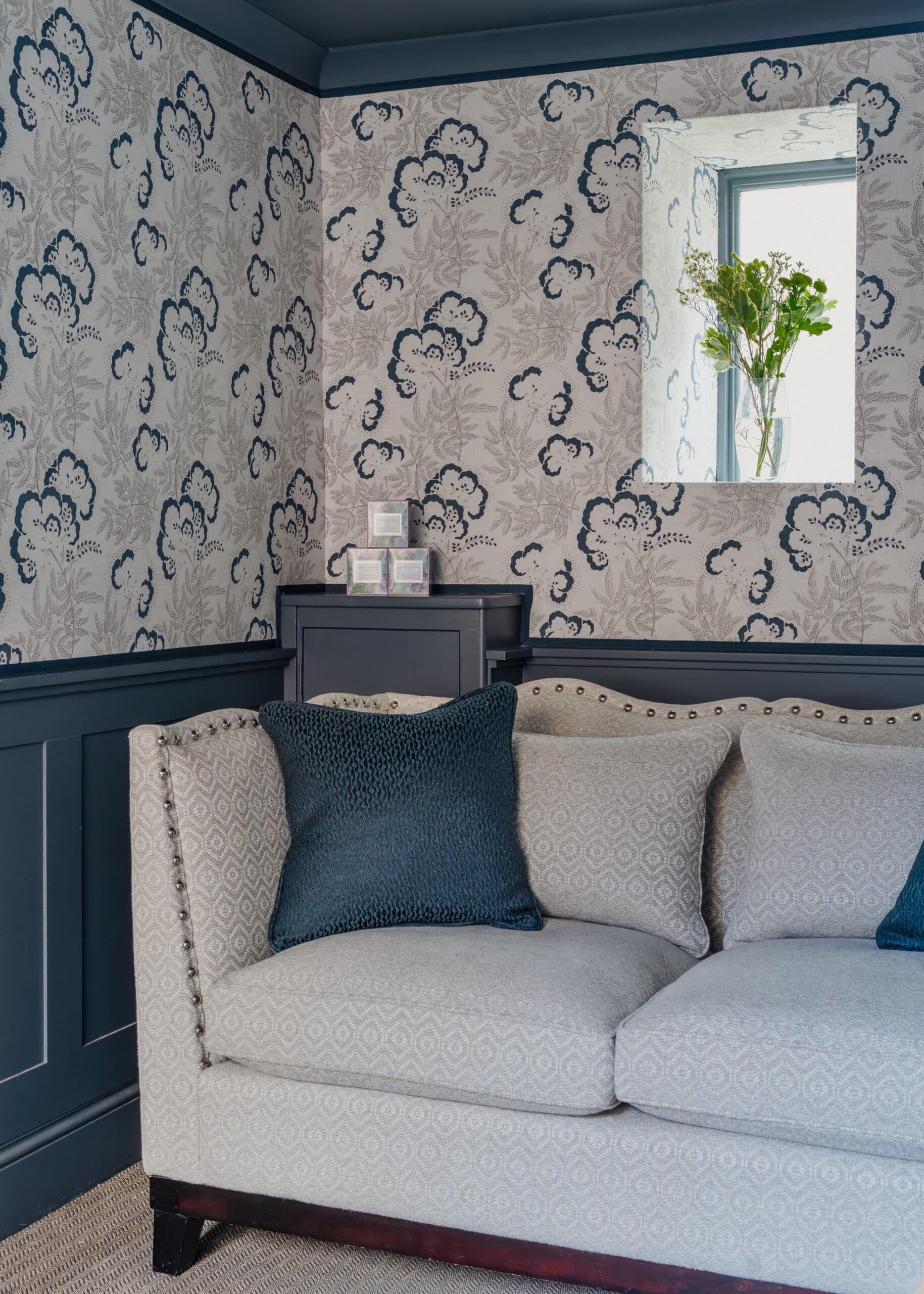 Fabric walls are shown here in Rapture & Wright Cloud Garden with all paintwork including ceiling in Zoffany Nocturne.