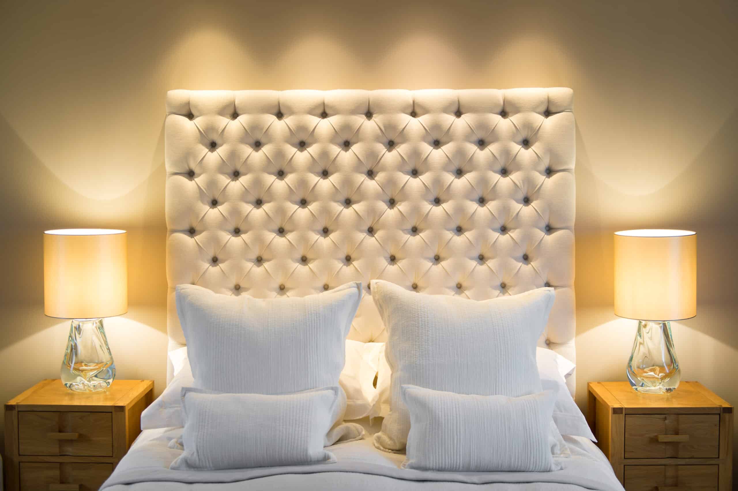 Contemporary Bedroom & Bathroom design in a private residence in Chelsea. Our own bespoke deep-buttoned headboard & side chairs, John Cullen lights, Porta Romana Lamps, Fired Earth Tiles, carpet supplied and fitted by Taylor & Baines.