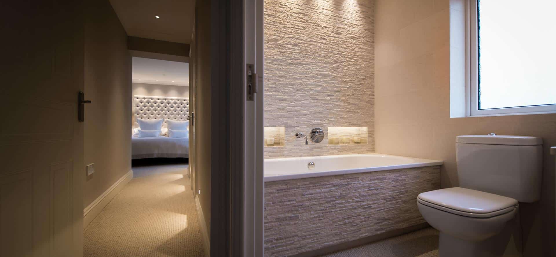 Contemporary Bedroom & Bathroom design in a private residence in Chelsea. Our own bespoke deep-buttoned headboard & side chairs, John Cullen lights, Porta Romana Lamps, Fired Earth Tiles, carpet supplied and fitted by Taylor & Baines.